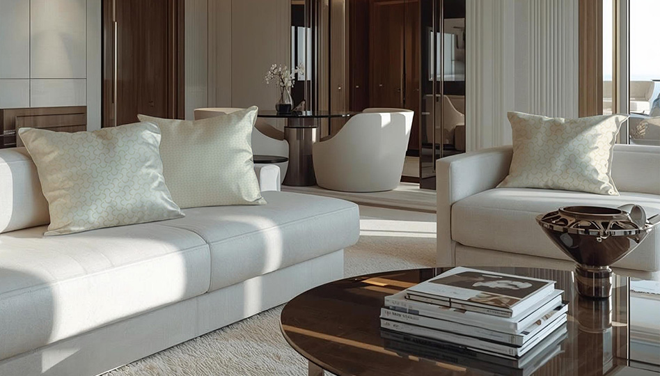 Defined by crisp white satin, precise geometric patterns, and refined velvet details, The White Sails Collection embodies architectural clarity and refined restraint within luxury yacht interiors. The interplay of light, structure, and texture creates a calm yet expressive presence. Designed for yachts, these cushions are ideal for standout master or VIP cabins and main salons, where they enhance spatial balance, highlight clean lines, and bring a timeless sense of contemporary elegance to carefully curated interiors.